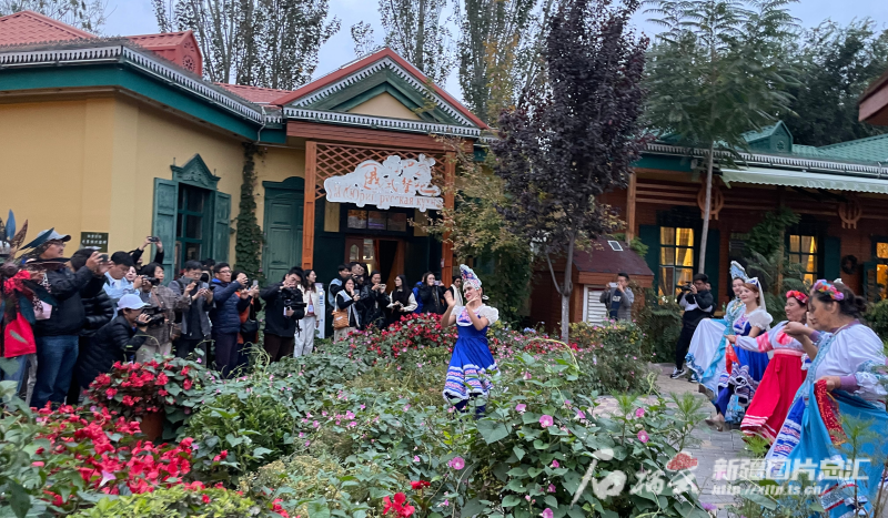 10月15日下午,參加第六屆世界媒體峰會的外媒代表在喀贊其民俗旅游區(qū)拍照留念。石榴云/新疆日報記者 郭玲 攝