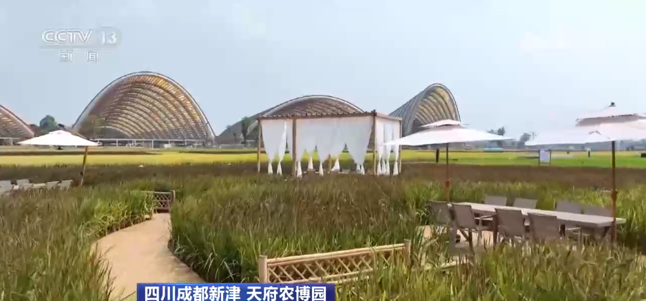 四川成都新津天府農(nóng)博園里,紫黑、紫紅、金黃三種特種稻種和大田水稻一起組成多彩圖案和造型,每畝預(yù)計(jì)產(chǎn)量躍上800斤的新高。稻田邊創(chuàng)意涌動(dòng),一杯杯稻田咖啡香醇四溢,一朵朵葵花正在向陽綻放,悠然演奏著喜悅豐收的“大地樂章”。