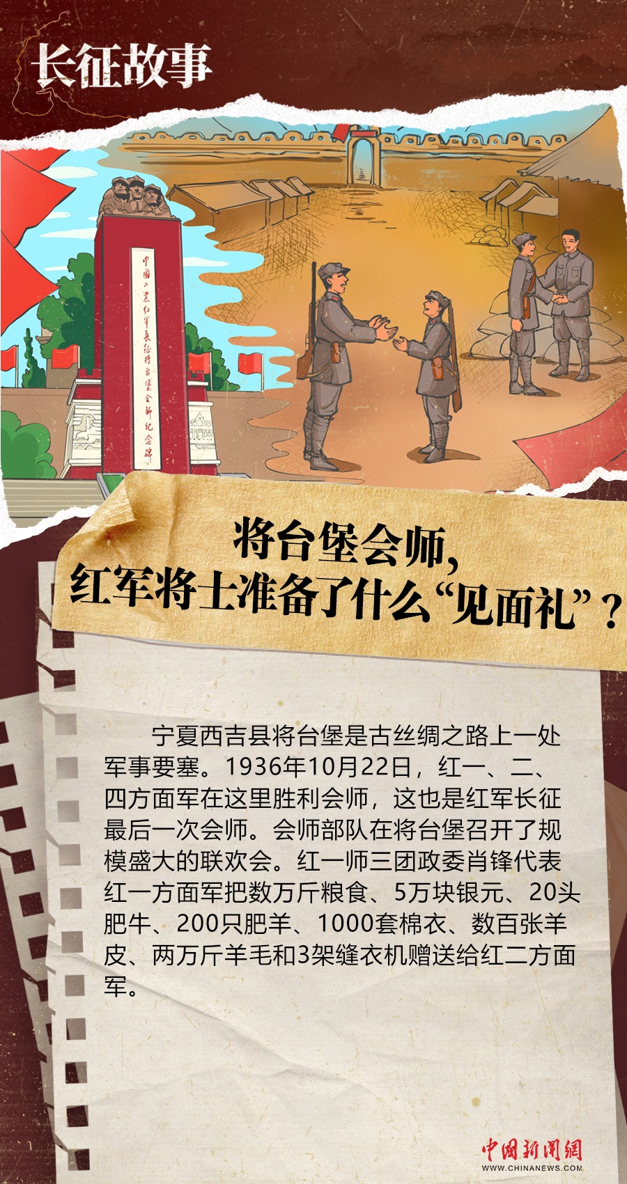 寧夏西吉縣將臺堡是古絲綢之路上一處軍事要塞。1936年10月22日,紅一、二、四方面軍在這里勝利會師,這也是紅軍長征最后一次會師。會師部隊(duì)在將臺堡召開了規(guī)模盛大的聯(lián)歡會。紅一師三團(tuán)政委肖鋒代表紅一方面軍把數(shù)萬斤糧食、5萬塊銀元、20頭肥牛、200只肥羊、1000套棉衣、數(shù)百張羊皮、兩萬斤羊毛和3架縫衣機(jī)贈送給紅二方面軍。