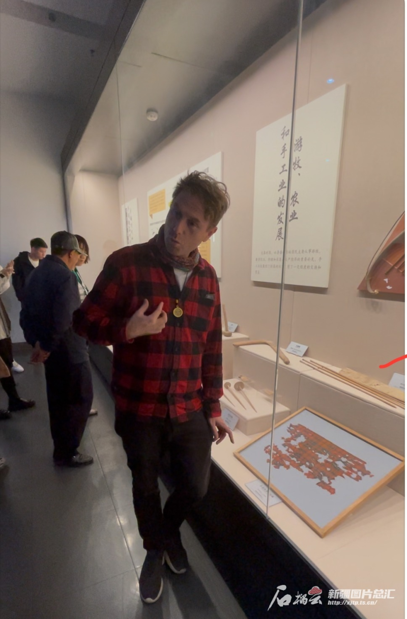 “你們看,這件文物的花紋,跟我的襯衫花紋一樣,古人也很時尚?。 ?0月20日,參加“中國有約·相約新疆”2024國際媒體采訪活動的自媒體創(chuàng)作者——來自英國的托比在吐魯番博物館參觀時,指著展示柜的一件文物興奮地說。