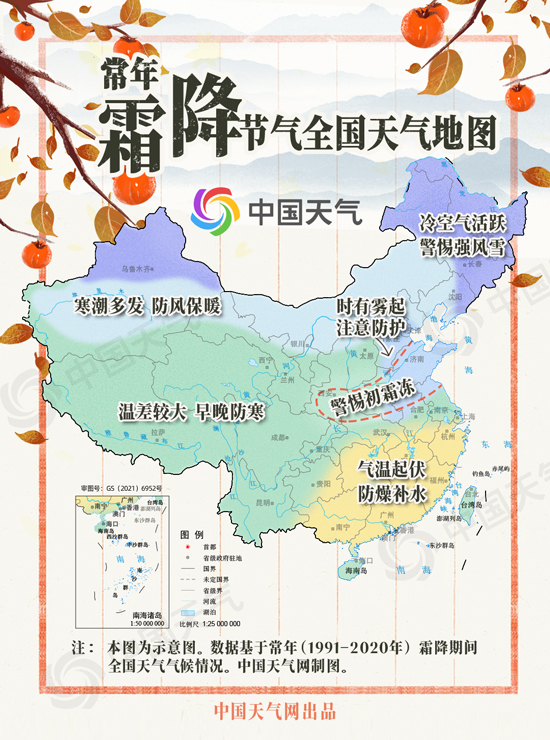 春生夏長,秋收冬藏,跟著節(jié)氣過日子。今天(10月23日)進(jìn)入秋天的最后一個(gè)節(jié)氣——霜降,意味著暮秋已至、新冬欲來。此時(shí),冷空氣頻繁,氣溫起伏加劇,進(jìn)入一年中晝夜溫差最大時(shí)段。人們常通過吃柿子、拔蘿卜、登高、賞菊、進(jìn)補(bǔ)等習(xí)俗,來適應(yīng)季節(jié)變化。中國天氣網(wǎng)特別推出霜降風(fēng)俗圖鑒和霜降全國天氣地圖,看看這個(gè)節(jié)氣怎么過。