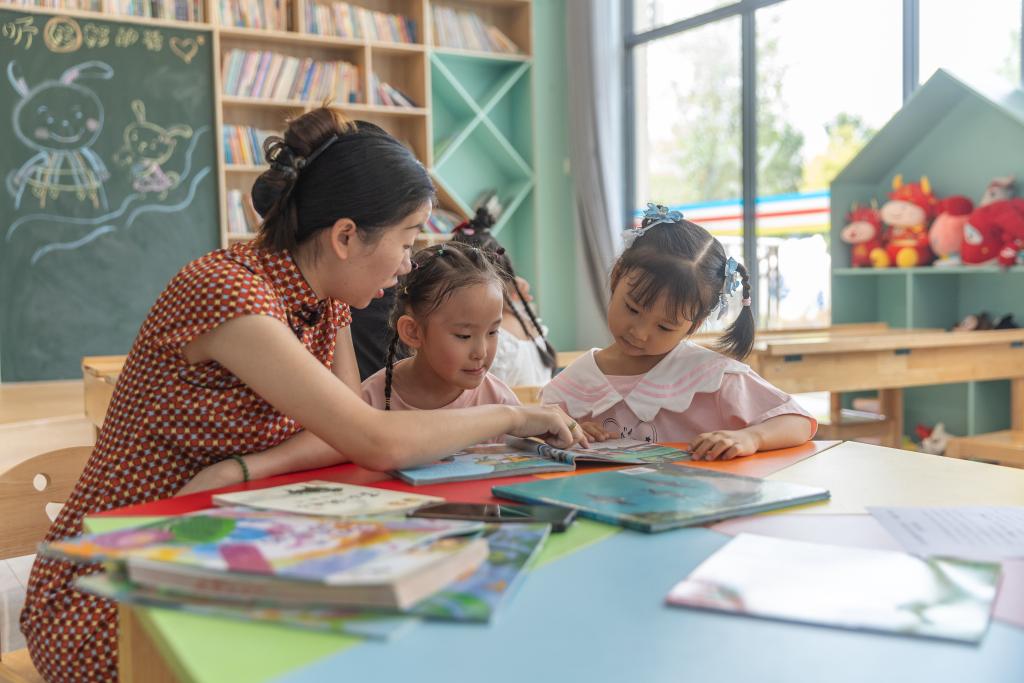 2024年9月25日,在重慶市江津區(qū)珞璜鎮(zhèn)碑亭社區(qū),社區(qū)居民郭明會(左一)帶著小孩閱讀用社保卡借閱的圖書。新華社記者 黃偉 攝