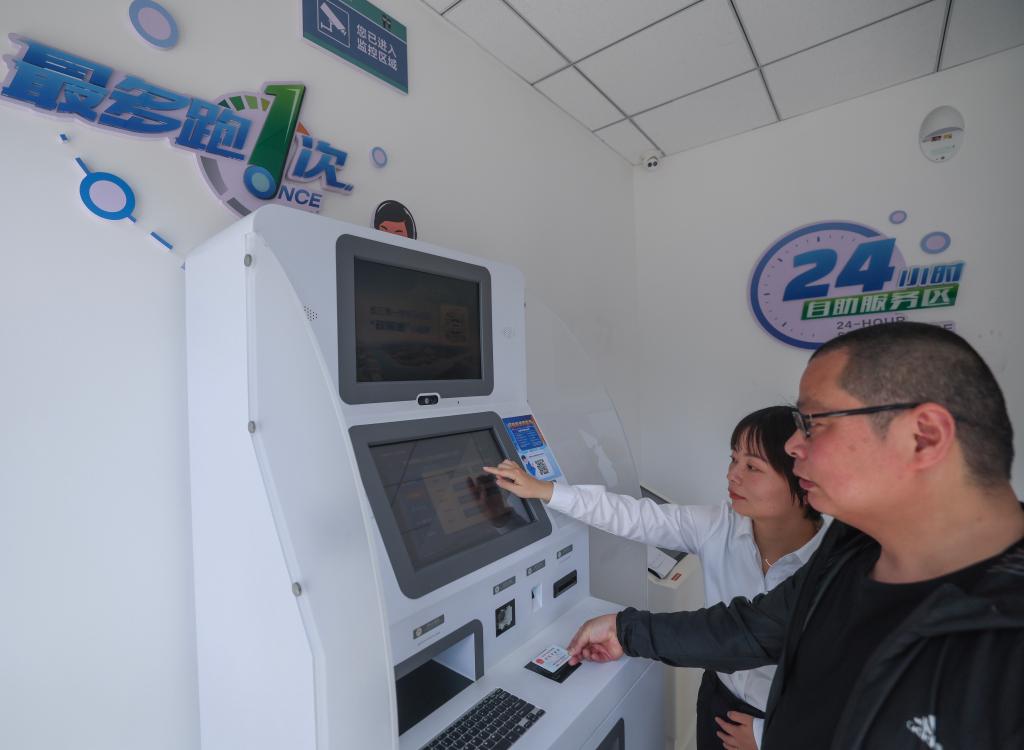 2024年5月9日,在浙江省嘉興市秀洲區(qū)王江涇鎮(zhèn)便民服務(wù)中心,工作人員指導(dǎo)居民對在蘇州工作期間的社保繳費記錄進(jìn)行自助跨省查詢。新華社記者 徐昱 攝