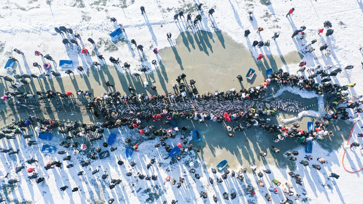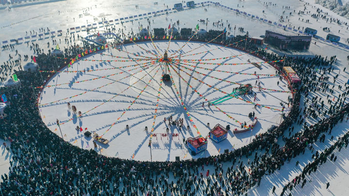 2023年12月28日,游客觀看查干湖冬捕“祭湖醒網(wǎng)”儀式(無人機照片)。新華社記者 張楠 攝