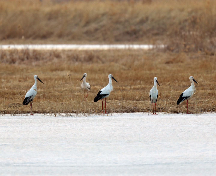 2020年3月22日,幾只東方白鸛在查干湖岸邊休息。新華社發(fā)