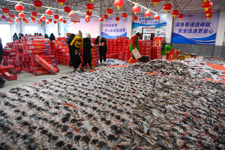 2023年12月27日,游客在查干湖漁場超市選購查干湖魚。新華社記者 張楠 攝