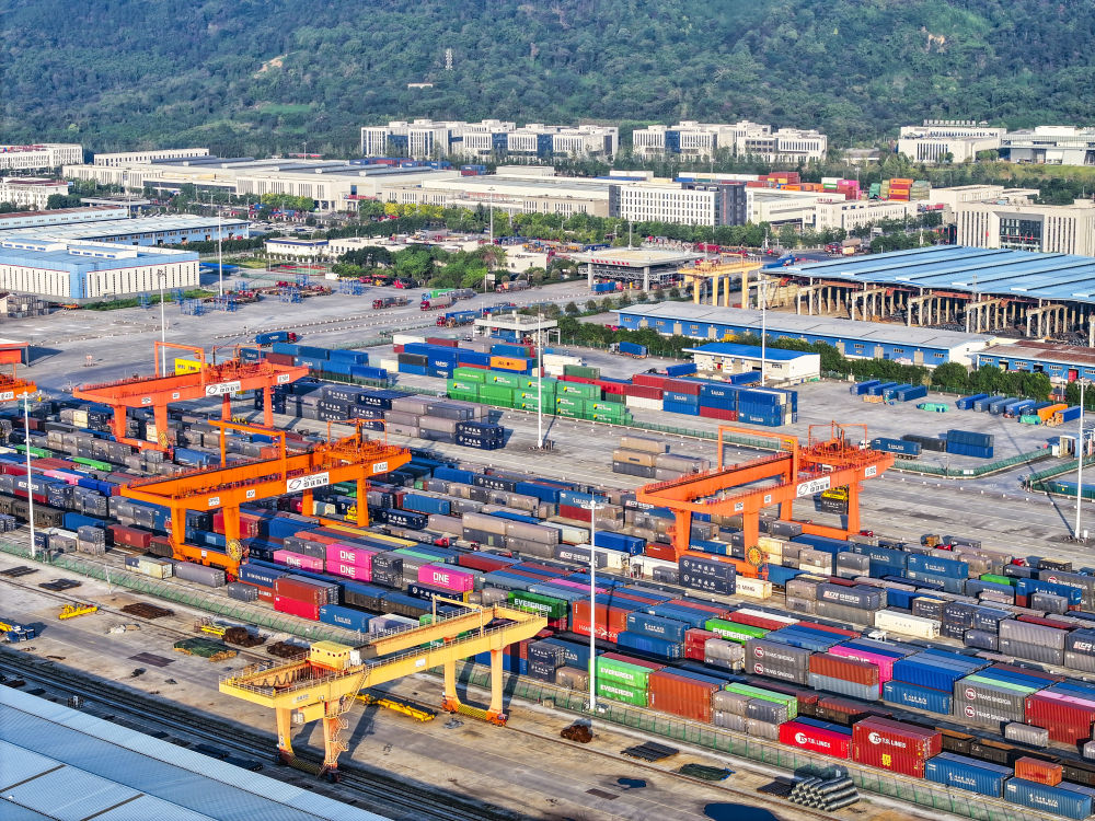 這是10月28日拍攝的陸海新通道重慶無(wú)水港(無(wú)人機(jī)照片)。