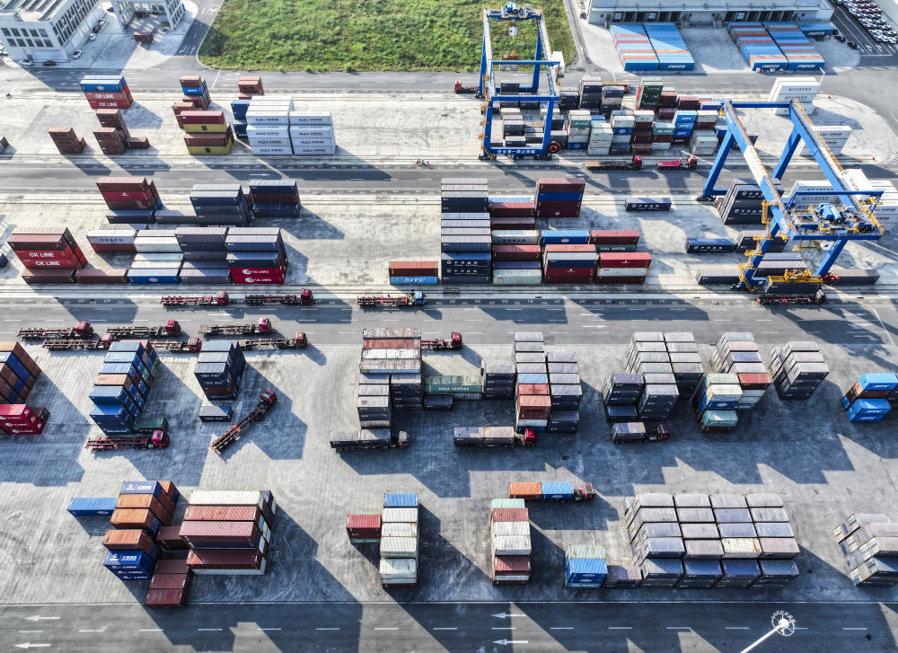 10月28日,轉(zhuǎn)運(yùn)卡車在陸海新通道重慶無(wú)水港來(lái)往穿梭(無(wú)人機(jī)照片)。