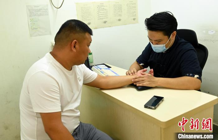 圖為陳冠巖在給患者號脈。 中新社記者 蔣雪林 攝