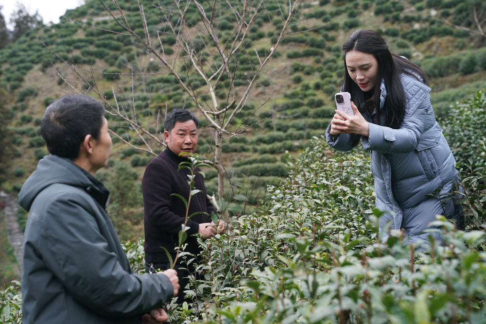 林紅梅(右一)在安康市紫陽縣城關(guān)鎮(zhèn)一處茶山上拍攝記錄茶園春管情況。新華社記者 邵瑞 攝