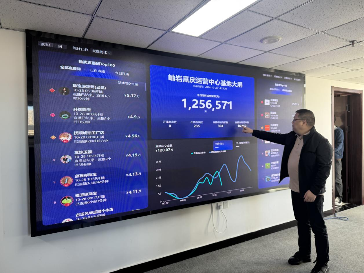 “1256571元,這是我們一上午的交易額”,岫巖熹慶運營中心的負責(zé)人指著墻上的大屏幕說:“通過這塊屏幕,不僅能實時看到各家商戶的開播、交易情況,還可以通過數(shù)據(jù)的波動及時發(fā)現(xiàn)存在的問題。”