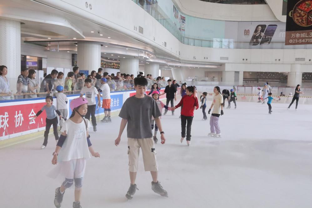 今年7月26日,人們?cè)谌A潤(rùn)上海萬(wàn)象城冰場(chǎng)參加滑冰等冰上活動(dòng)。(岳遠(yuǎn) 攝)