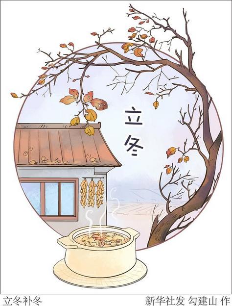 立冬時節(jié),各地有豐富多彩的傳統(tǒng)習(xí)俗。比如,民間有祭祖、飲宴、卜歲等習(xí)俗,以時令佳品向祖靈祭祀,祈求來年是豐年;還有“補冬”,北方有“立冬補冬,補嘴空”的諺語,人們習(xí)慣在立冬這天吃餃子,因為餃子外形似耳朵,人們認為吃了它,冬天耳朵就不受凍。此外,還有釀黃酒、吃生蔥等。