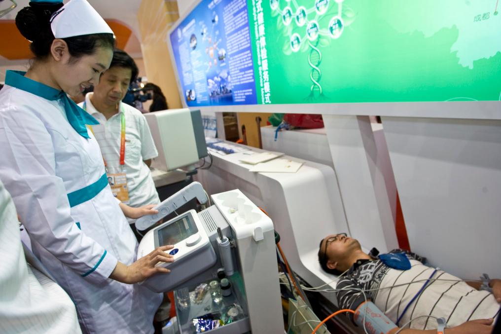 2012年5月28日,觀眾在首屆中國(北京)國際服務貿(mào)易交易會(簡稱“京交會”,后發(fā)展為中國國際服務貿(mào)易交易會,即“服貿(mào)會”)體驗全方位健康體檢。新華社發(fā)(趙冰 攝)