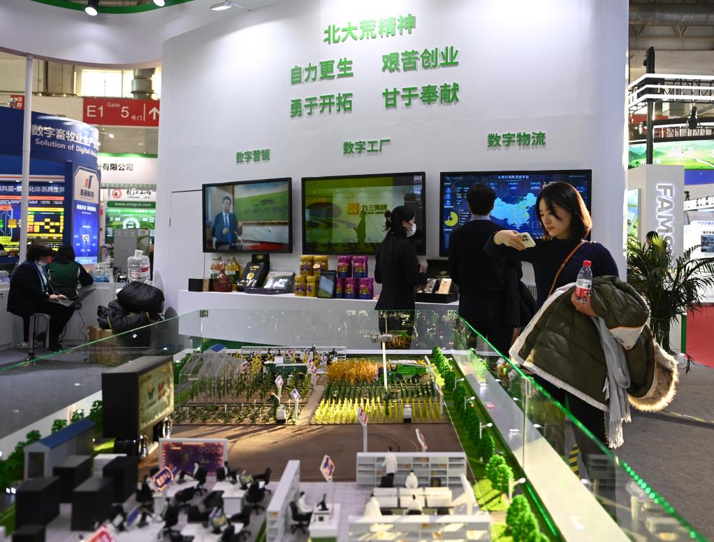 2023年11月30日,參觀者在首屆中國國際供應鏈促進博覽會(簡稱“鏈博會”)綠色農(nóng)業(yè)鏈展區(qū)北大荒集團展臺前觀看智慧育種解決方案。新華社記者 蔡湘鑫 攝