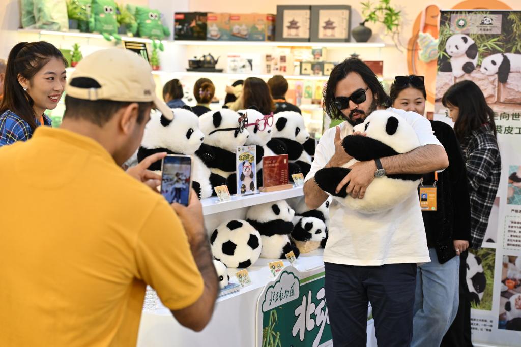 2024年9月16日,國外參觀者在服貿(mào)會首鋼園區(qū)文旅服務專題展區(qū)抱著北京動物園推出的大熊貓文創(chuàng)玩偶合影。新華社記者 李鑫 攝