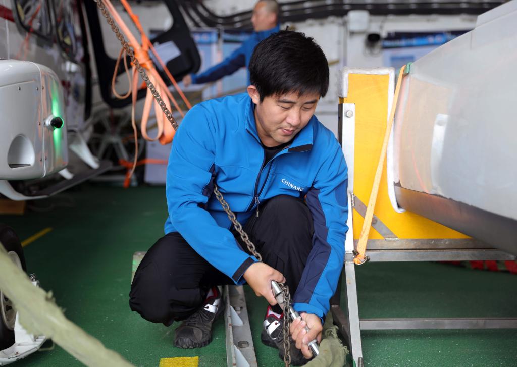 執(zhí)行中國第41次南極考察任務(wù)的“雪龍”號和“雪龍2”號于北京時間2024年11月19日開始穿越“咆哮”西風(fēng)帶。這是“雪龍2”號直升機(jī)機(jī)組成員畢凌峰在擰緊直升機(jī)固定件。新華社記者黃韜銘攝