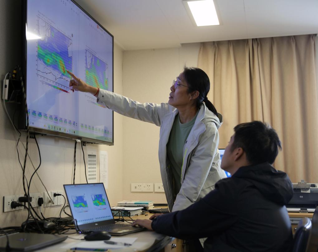執(zhí)行中國第41次南極考察任務(wù)的“雪龍”號和“雪龍2”號于北京時間2024年11月19日開始穿越“咆哮”西風(fēng)帶。這是“雪龍2”號隨船氣象保障員劉素芳(左)在研判天氣情況,規(guī)劃航行路線。新華社記者黃韜銘攝