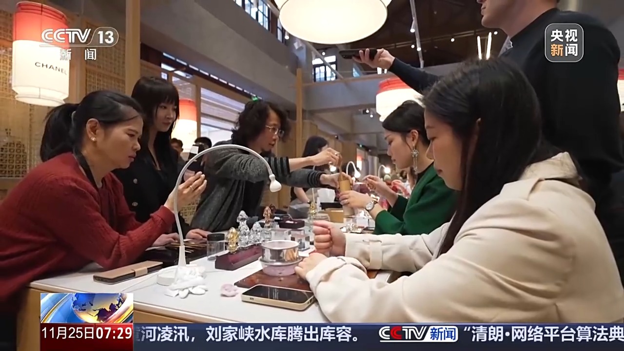 總臺(tái)央視記者 高媛:我身后這個(gè)不大的空間里擠滿了人,這里聚集了17個(gè)來自法國的品牌。它們展出的不只是產(chǎn)品,而是背后的工藝。精美的產(chǎn)品變成了一針一線的故事,觀眾還可以參與其中。
