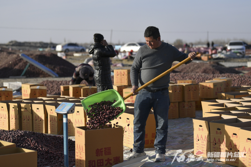 11月29日,農(nóng)民在晾曬場將晾曬好的紅棗裝箱。