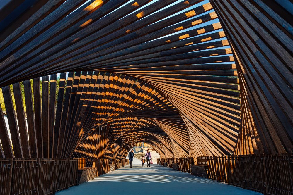 緊接著,設(shè)計師們聯(lián)手用竹子打造了一個充滿設(shè)計感的竹藝村落——龍泉國際竹建筑文創(chuàng)生活村落。