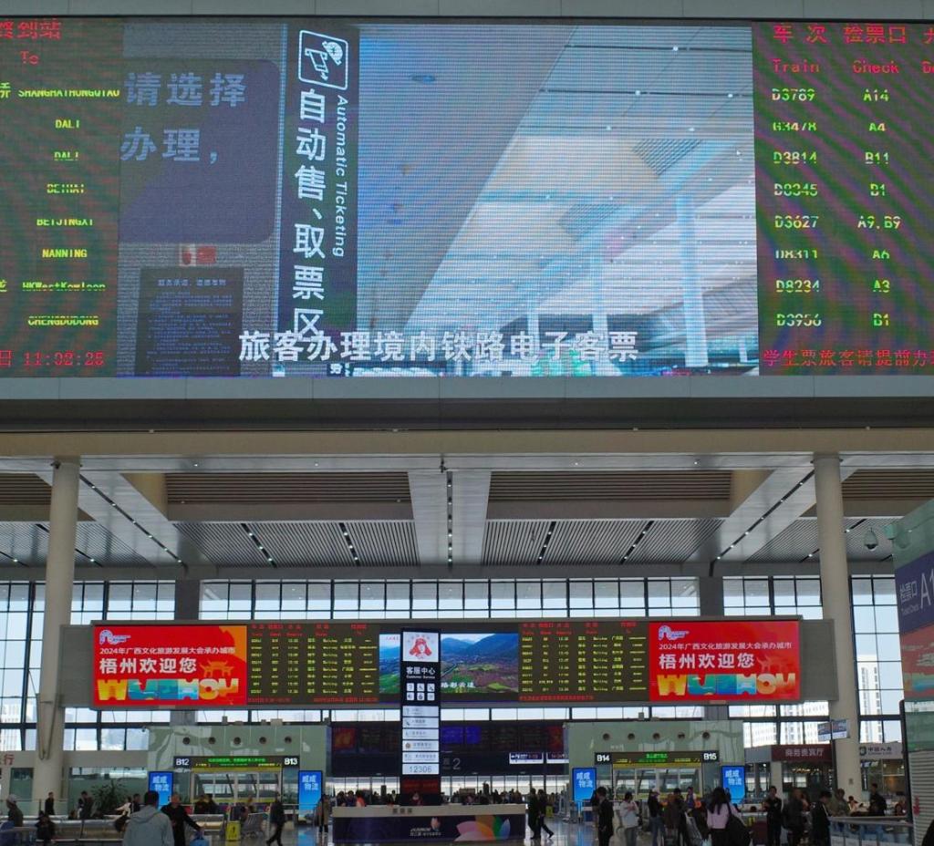 12月1日,在廣西南寧市南寧東站,車站大屏正播放鐵路電子客票服務(wù)宣傳片。 新華社記者李歡 攝