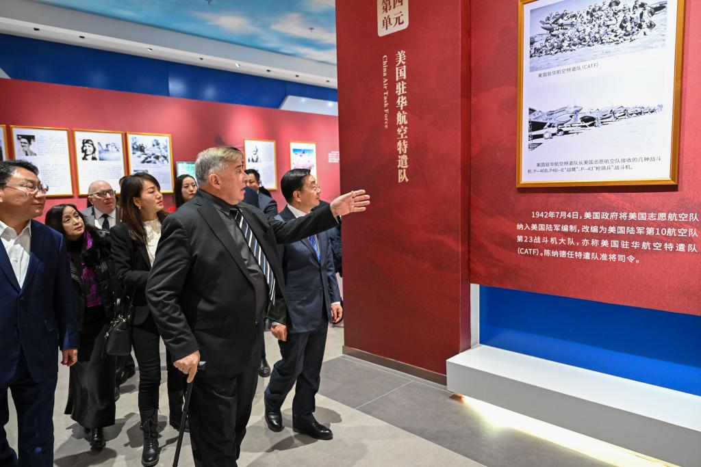 11月30日,美中航空遺產(chǎn)基金會代表團成員在烏魯木齊文化中心展覽館觀看“銘記英雄——飛虎隊主題歷史圖片展巡展(新疆)”。新華社記者 丁磊 攝