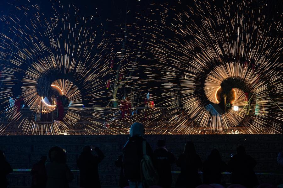2023年1月23日,觀眾在江蘇盱眙第一山歷史文化街區(qū)觀看打鐵花表演。 新華社記者 季春鵬 攝