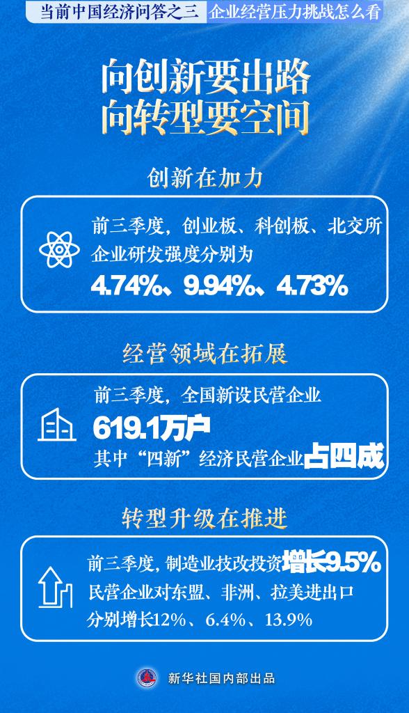 前三季度,全國新設(shè)民營企業(yè)619.1萬戶,其中“四新”經(jīng)濟(jì)民營企業(yè)占四成,經(jīng)營領(lǐng)域在拓展。