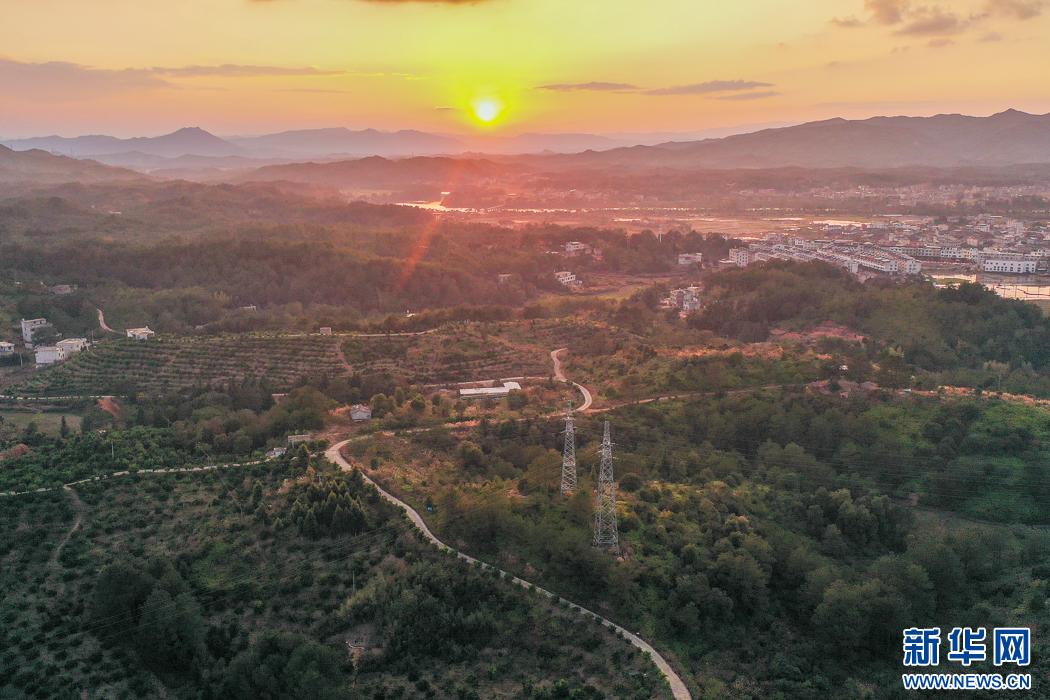 這是在長汀縣三洲鎮(zhèn)豐盈美麗生態(tài)農(nóng)場(chǎng)拍攝到的落日景觀。如今,這里月月有花開,季季有果采,昔日“火焰山”變成了“花果山”(無人機(jī)照片)。新華網(wǎng) 肖和勇 攝