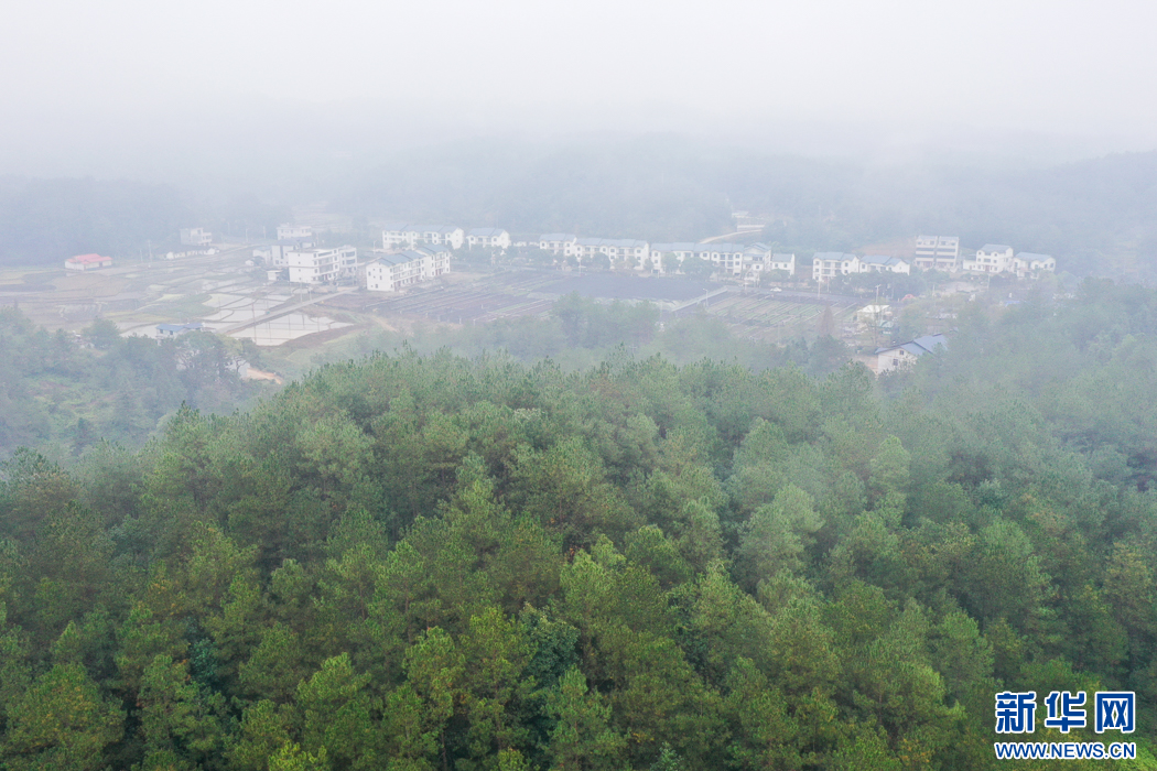 這是在長汀縣水土保持科教園附近拍攝到的鄉(xiāng)村冬日景觀。晨霧中,綠色森林環(huán)抱美麗鄉(xiāng)村(無人機(jī)照片)。新華網(wǎng) 肖和勇 攝