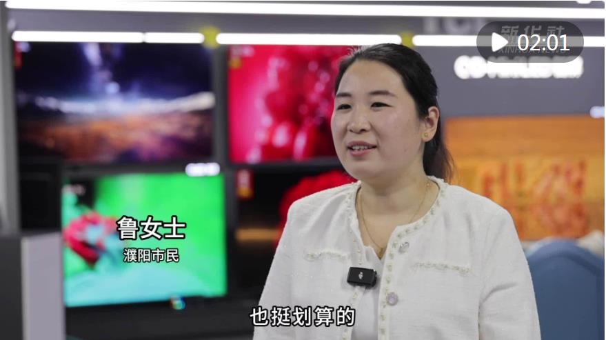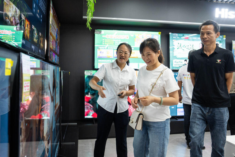 在湖南省岳陽市汨羅市屈子祠鎮(zhèn)雙楚村,彭坤、彭建華夫婦家中有一臺使用了近十年的32英寸液晶電視機。今年,在以舊換新政策的吸引下,他們決定更換一臺更大更好的電視機。根據(jù)實際需求和個人喜好,在反復對比后,他們換購了一臺75英寸的新款液晶電視機。舊電視在新機送貨上門時被當場回收,疊加各種補貼后,實際成交價較廠商定價優(yōu)惠了近30%。(新華社記者 陳思汗 攝)
