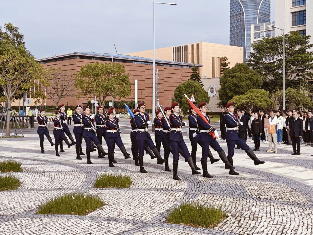 “正步走!”早晨八點,曙光照拂澳大蓮花廣場,身著海軍藍制服的學(xué)生邁著鏗鏘有力的步伐走向升旗臺。國歌響起,五星紅旗在澳門特區(qū)區(qū)旗和澳門大學(xué)校旗映襯下,冉冉升起,迎風招展。