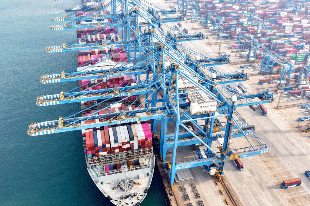 2024年2月10日,在山東港口青島港全自動化碼頭,貨輪在裝卸外貿(mào)集裝箱。新華社發(fā)(俞方平攝)