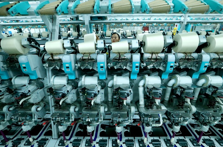 2024年11月27日,在位于青島市即墨區(qū)龍山街道的青島即發(fā)紡織科技有限公司智慧紡紗生產(chǎn)線上,工人在生產(chǎn)高端纖維。新華社發(fā)(梁孝鵬攝)