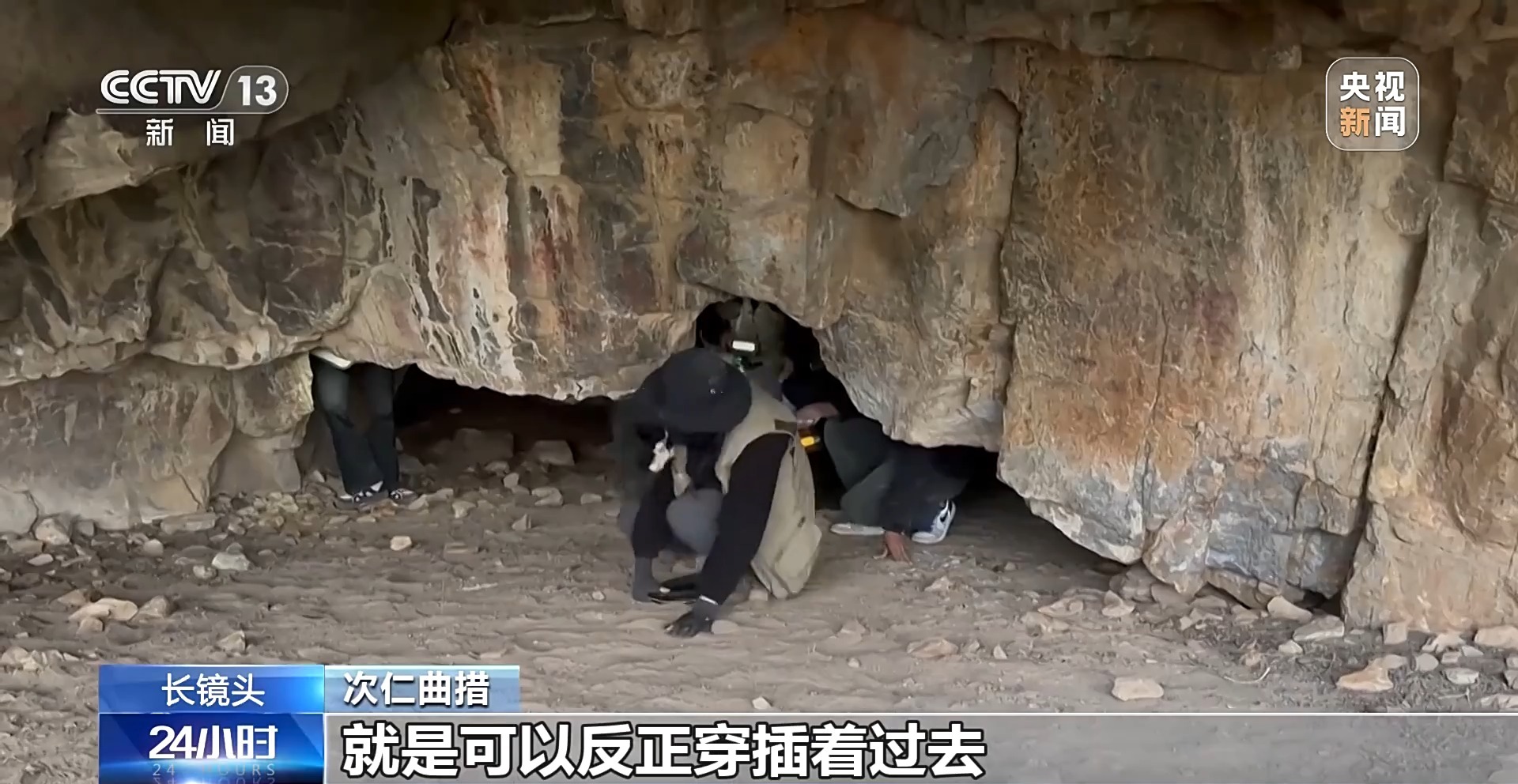 次仁曲措:當(dāng)?shù)氐南驅(qū)дf洞里面還有幾個(gè)巖畫,我們就趴著進(jìn)去了。洞里面還有幾個(gè)洞口,可以穿插著過去,感覺像拆盲盒一樣,非常好奇,想迫不及待地知道洞口有哪個(gè)巖畫,這些人像在跳舞或者在舉行某種儀式。