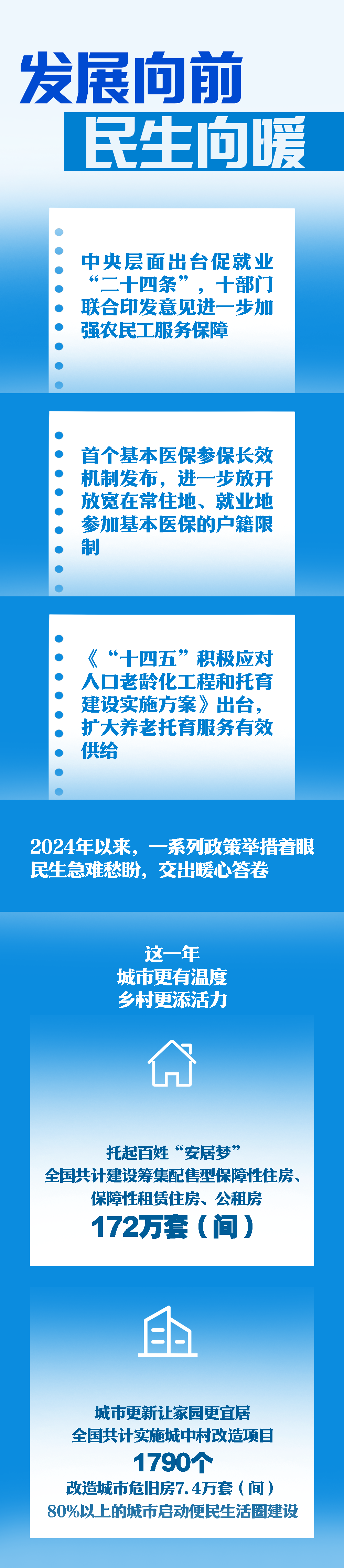 2024年以來,從中央層面出臺促就業(yè)“二十四條”,到首個基本醫(yī)保參保長效機制發(fā)布,再到聚焦“一老一小”領(lǐng)域擴大養(yǎng)老托育服務(wù)有效供給,一系列政策舉措著眼民生急難愁盼,書寫暖心答卷。