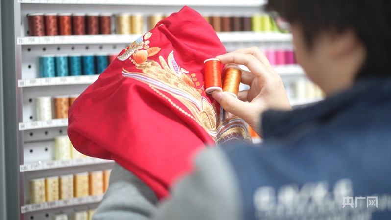 家紡企業(yè)內(nèi),設(shè)計(jì)師在眾多繡花線中選色(央廣網(wǎng)記者 王姝姝 攝)