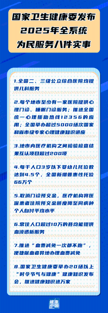 國家衛(wèi)生健康委31日發(fā)布2025年全系統(tǒng)為民服務八件實事,包括: