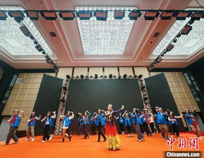 圖為參加交流團的香港青年(藍衣)跟隨當?shù)孛癖妼W習新疆特色舞蹈?!≈鬓k方 供圖