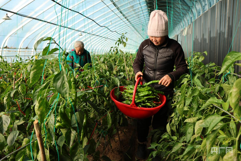 蘇家堡村的蔬菜大棚里,工人們正在摘螺絲椒(央廣網(wǎng)發(fā) 胡建華 攝)