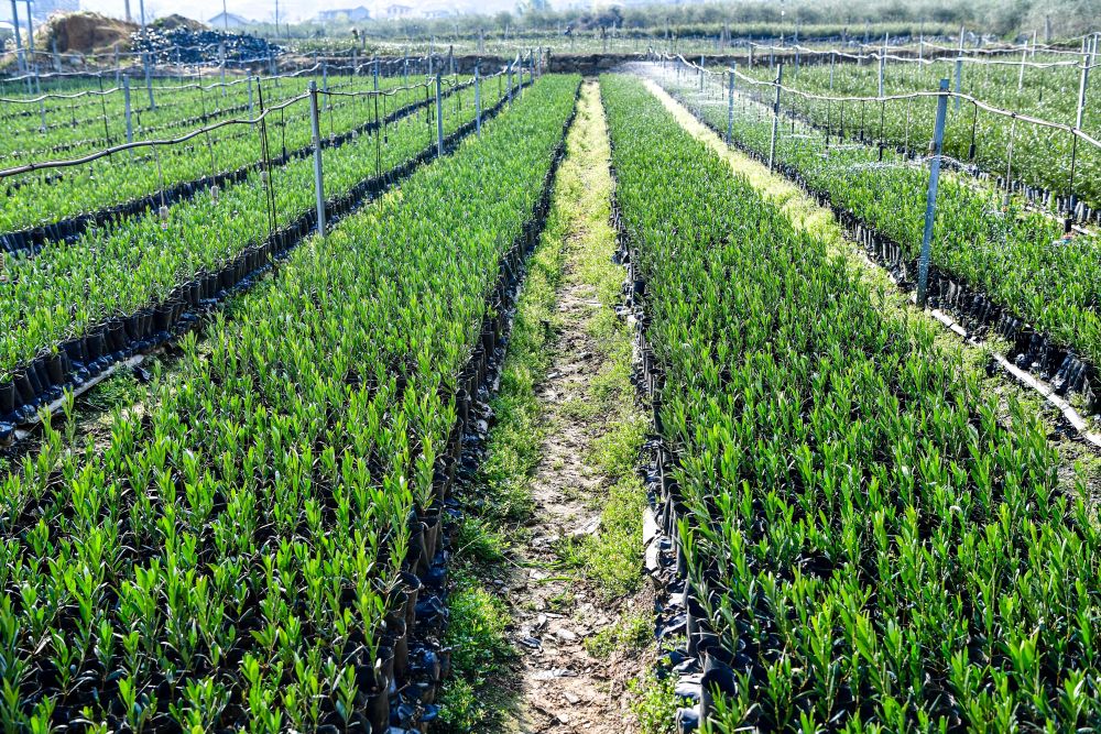 在四川冕寧縣元升油橄欖產(chǎn)業(yè)園,自動(dòng)噴淋系統(tǒng)在為培育中的油橄欖樹(shù)幼苗澆水(2024年12月12日攝)。