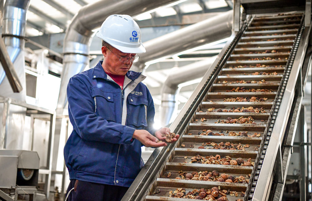 2024年12月11日,涼山億豐油脂有限公司的員工在核桃脫殼生產(chǎn)線旁工作。