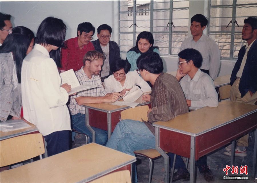 20世紀80年代末,潘維廉在廈門大學的課堂上與學生交流。受訪者供圖