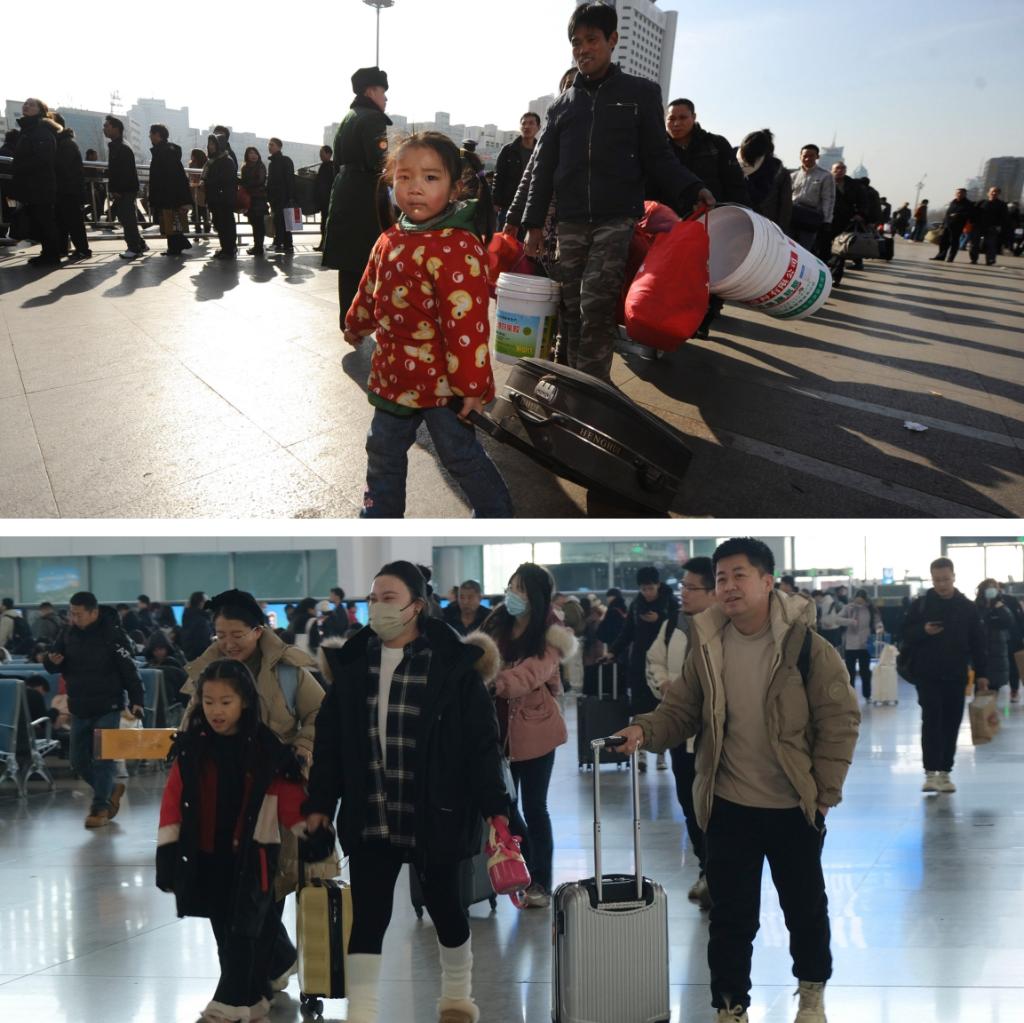 拼版照片。上圖為:2011年1月25日,在太原火車站,來自安徽的小女孩鐘媛媛和父母一起回家(新華社記者燕雁攝);下圖為:2025年1月18日,在太原南站,旅客踏上回家路(新華社記者王學濤攝)。新華社發(fā)