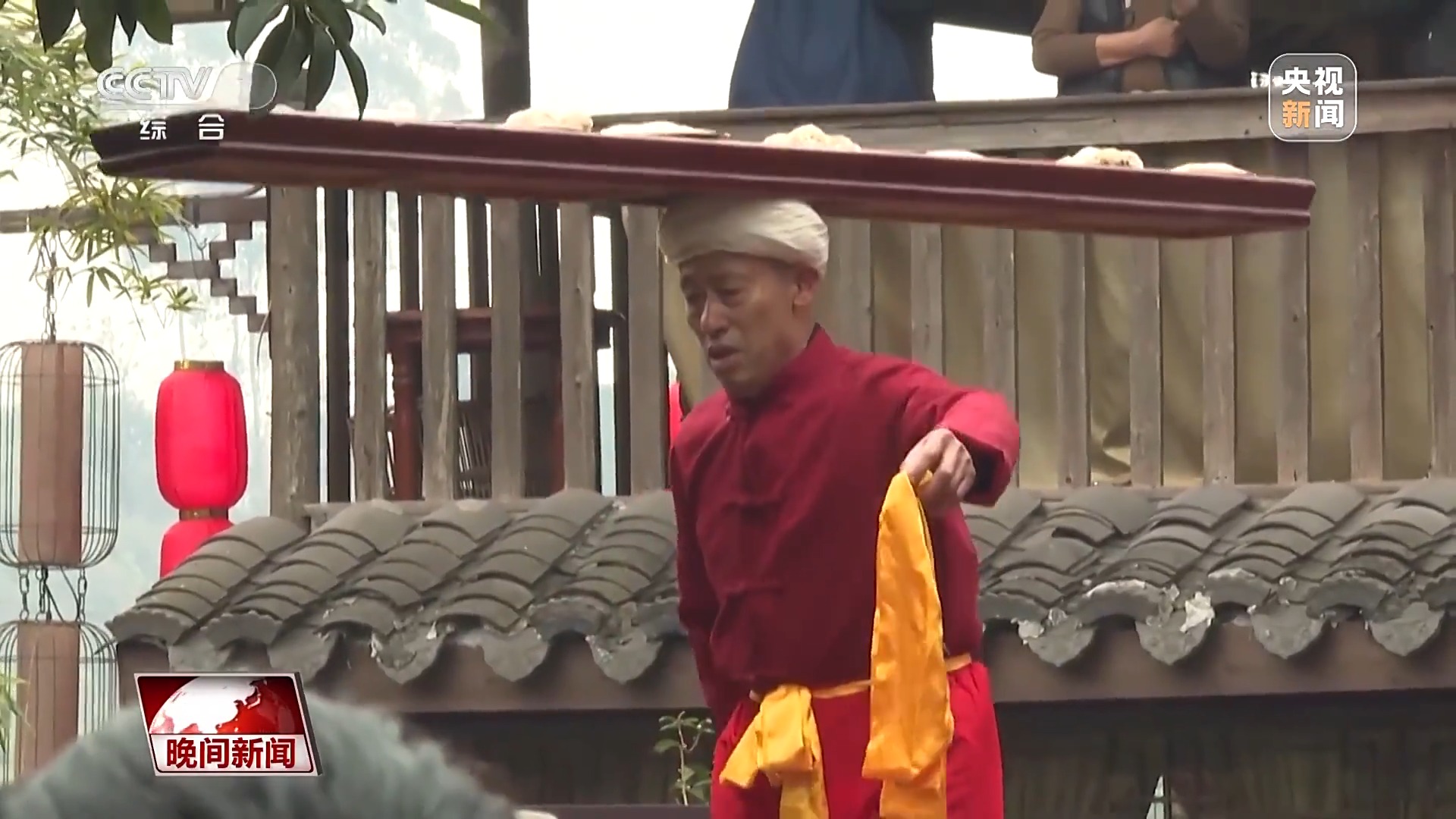 古鎮(zhèn)街道狹長,辦宴席時需要快速傳菜,于是便有了“打盆”這種獨特的上菜方式。在我們的左手邊,就有一位當?shù)乩先苏诒硌荽蚺杞^技。