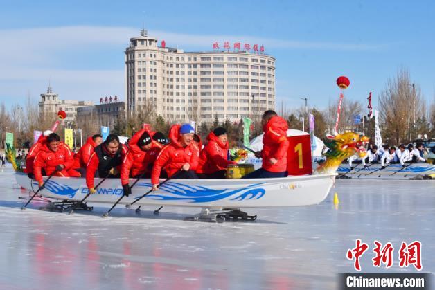1月20日,內(nèi)蒙古盛世柳蘭代表隊代表中國參加錫林郭勒國際冰上龍舟錦標賽。孫沐野攝