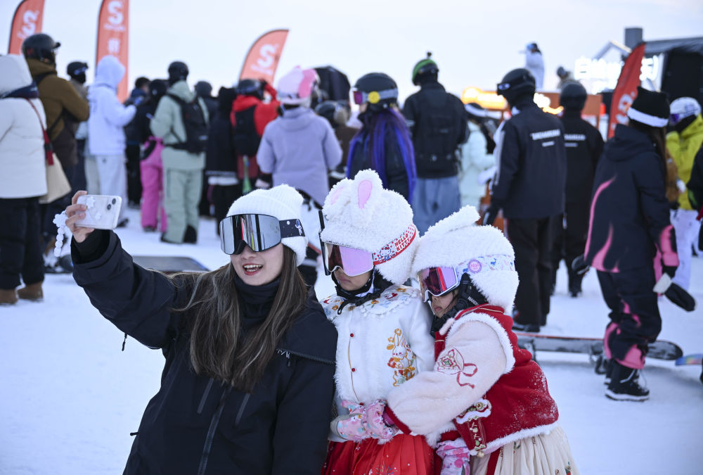 1月21日,游客在將軍山國際滑雪度假區(qū)合影。