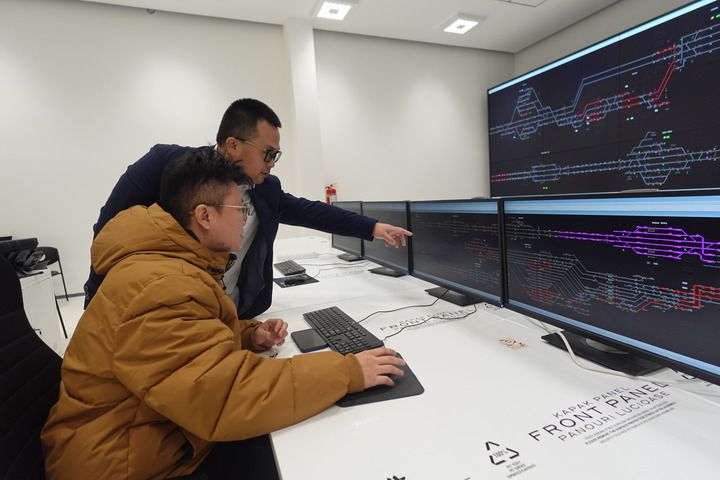 春節(jié)前夕,在匈塞鐵路塞爾維亞段項(xiàng)目位于諾維薩德的調(diào)度指揮中心,項(xiàng)目副總工程師楊冠嶺(后)詢問(wèn)線路試運(yùn)行情況。新華社記者 陳穎 攝
