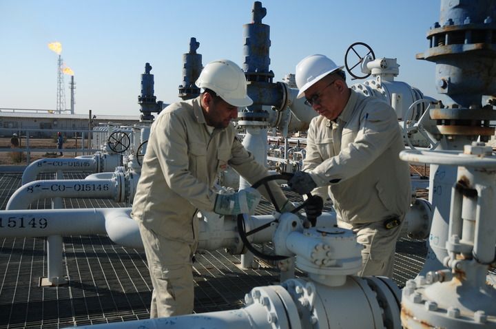1月28日,在伊拉克艾哈代布油田,中國(guó)綠洲石油公司生產(chǎn)管理部經(jīng)理王暉(右)在項(xiàng)目現(xiàn)場(chǎng)巡檢。新華社記者 段敏夫 攝